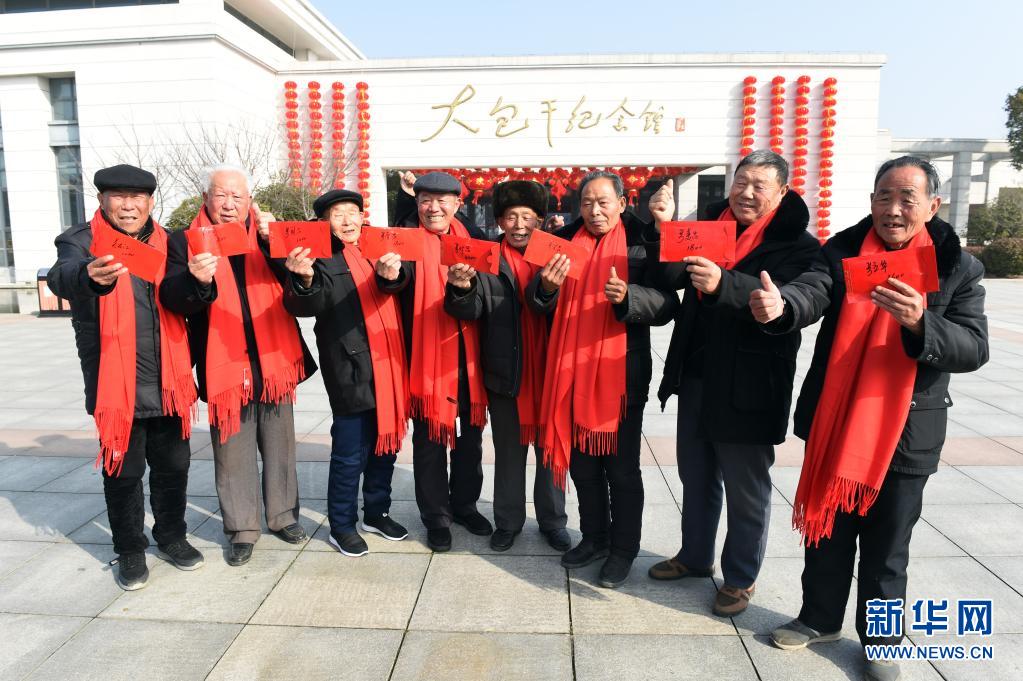 23日,在安徽省滁州市鳳陽縣小崗村,8大包干帶頭人在大包干紀念館前展示自家領(lǐng)取的集體經(jīng)濟收益股權(quán)分紅。新華社記者 周牧 攝