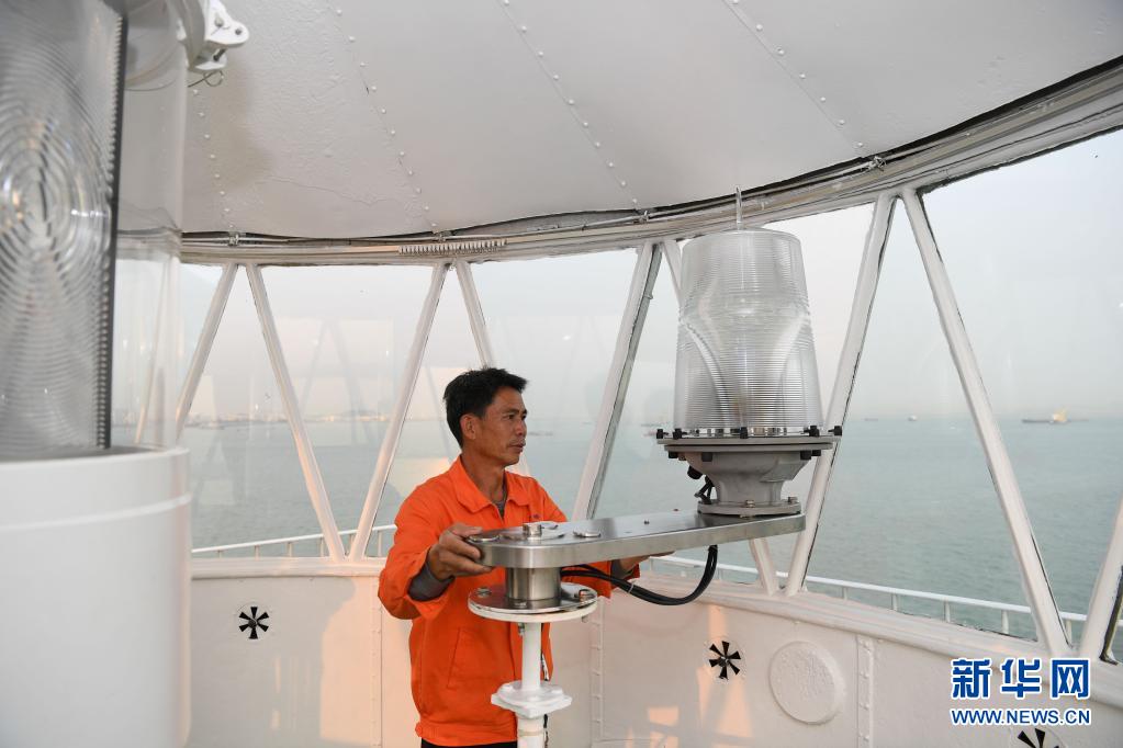 在珠江口伶仃洋北端的舢舨洲,航標工黃燦明在檢查燈塔輔燈設(shè)備(2019年4月2日攝)。新華社記者 鄧華 攝