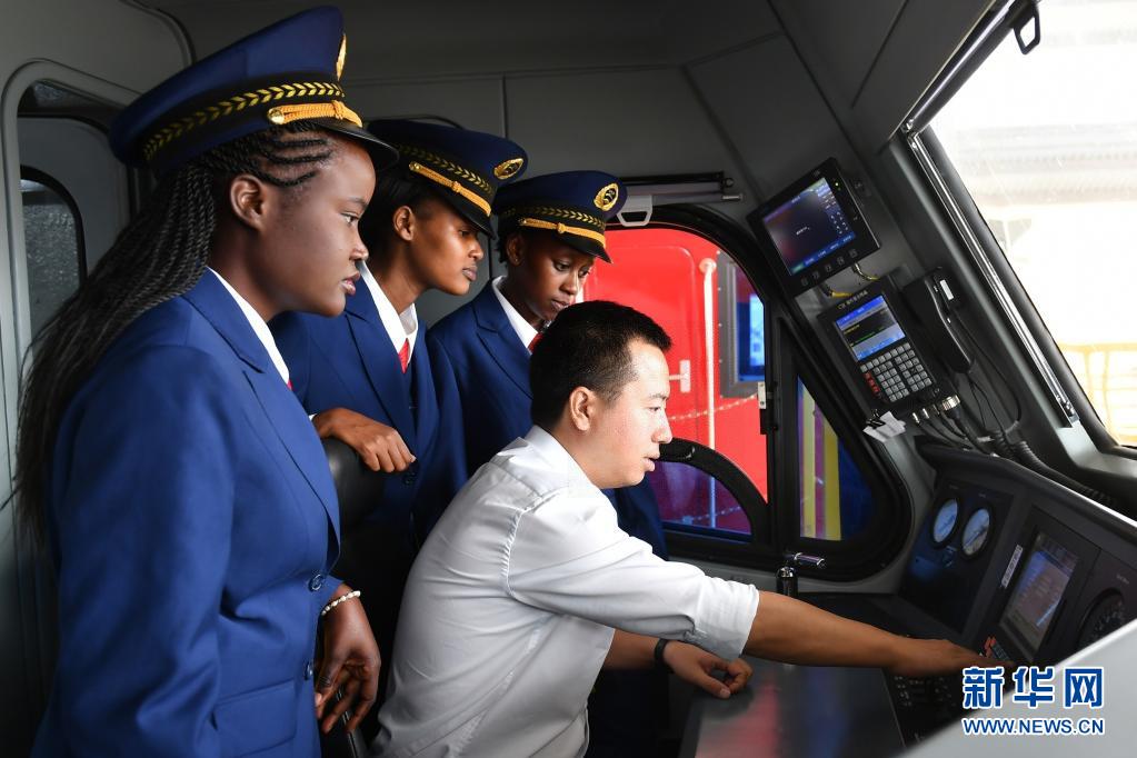 在肯尼亞內(nèi)羅畢,肯尼亞火車司機跟隨中國老師張程熟悉操作流程(2017年5月17日攝)。新華社記者 孫瑞博 攝