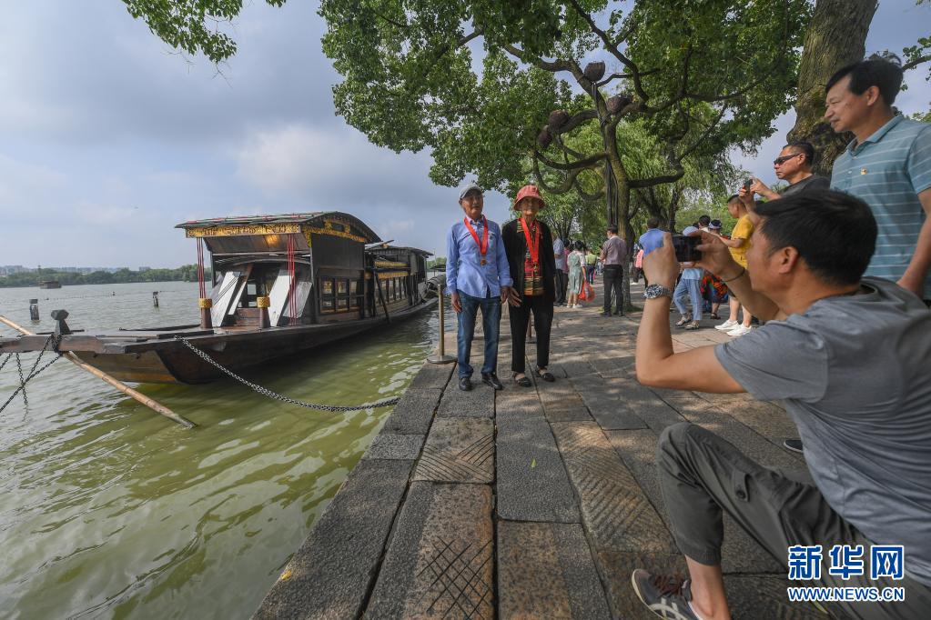 71日,兩名老黨員在浙江嘉興南湖湖心島停泊的南湖紅船旁拍照留影。新華社記者 徐昱 攝