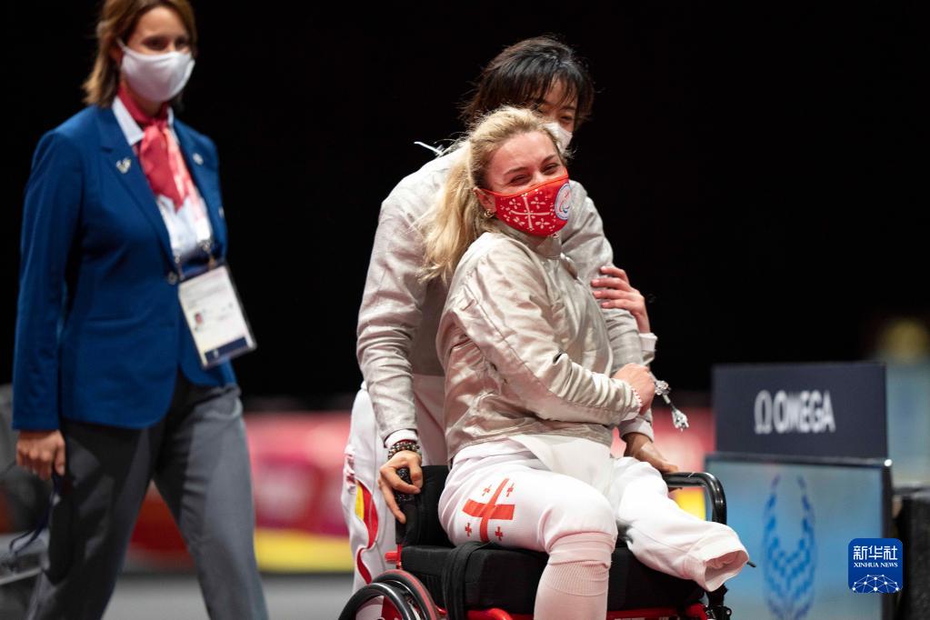8月25日,在東京殘奧會(huì)輪椅擊劍女子佩劍個(gè)人賽A級(jí)決賽后,中國選手邊靜(中)推著格魯吉亞選手妮諾(右)離開比賽場(chǎng)地。新華社記者 熊琦 攝