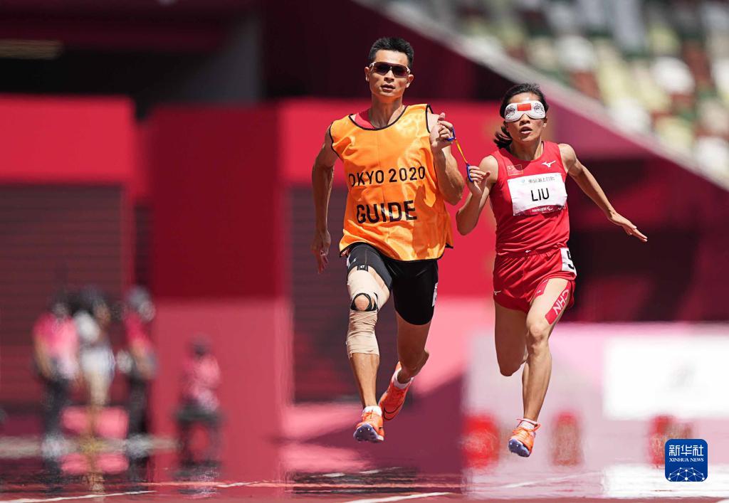 8月30日,中國選手劉翠青(右)和領(lǐng)跑員徐冬林在東京殘奧會(huì)田徑女子100米T11級(jí)第一輪預(yù)賽中。新華社記者 熊琦 攝