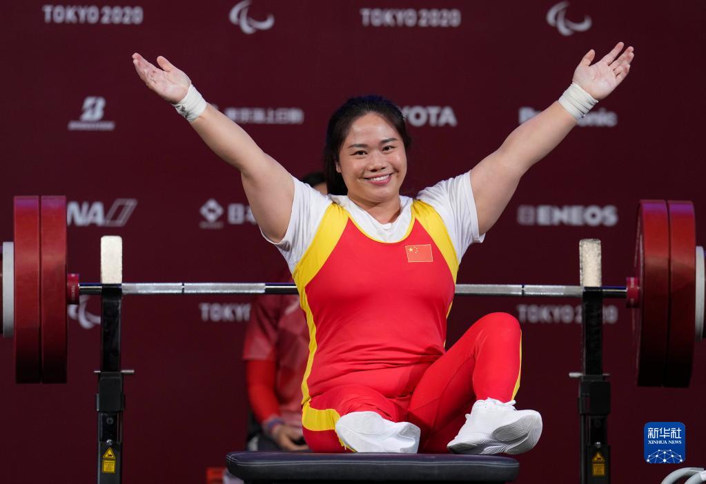 8月28日,中國選手譚玉嬌在東京殘奧會(huì)舉重女子67公斤級(jí)決賽中慶祝。新華社記者 胡虎虎 攝