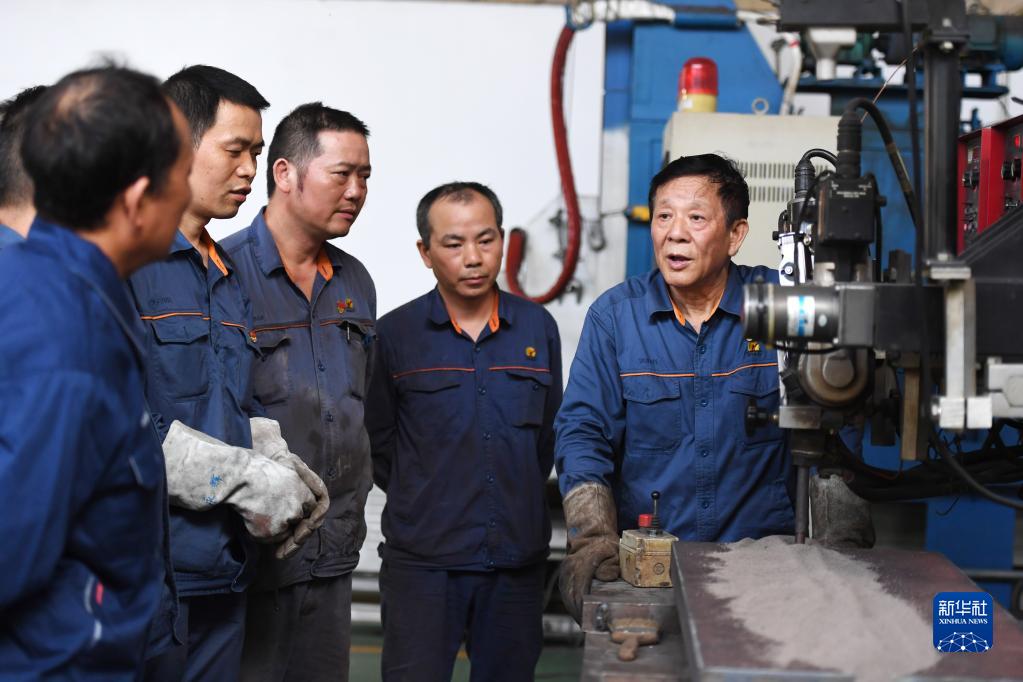 6月17日,艾愛國(左一)在湖南湘潭湘鋼高級技工學(xué)校焊接實(shí)習(xí)基地檢查學(xué)生的焊接作業(yè)。新華社記者 薛宇舸 攝