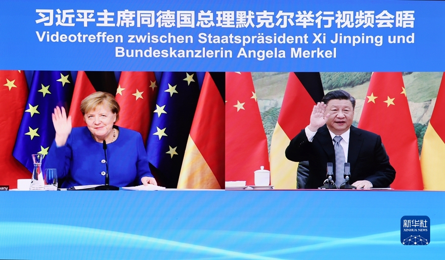 10月13日,國(guó)家主席習(xí)近平在北京同德國(guó)總理默克爾舉行視頻會(huì)晤。新華社記者 李學(xué)仁 攝