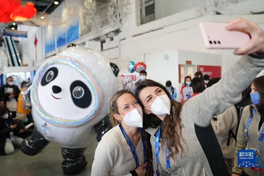 2月12日,北京冬奧會主媒體中心舉辦集體采訪活動,現(xiàn)場觀眾與北京2022年冬奧會吉祥物“冰墩墩”自拍留念。 新華社記者 鞠煥宗 攝