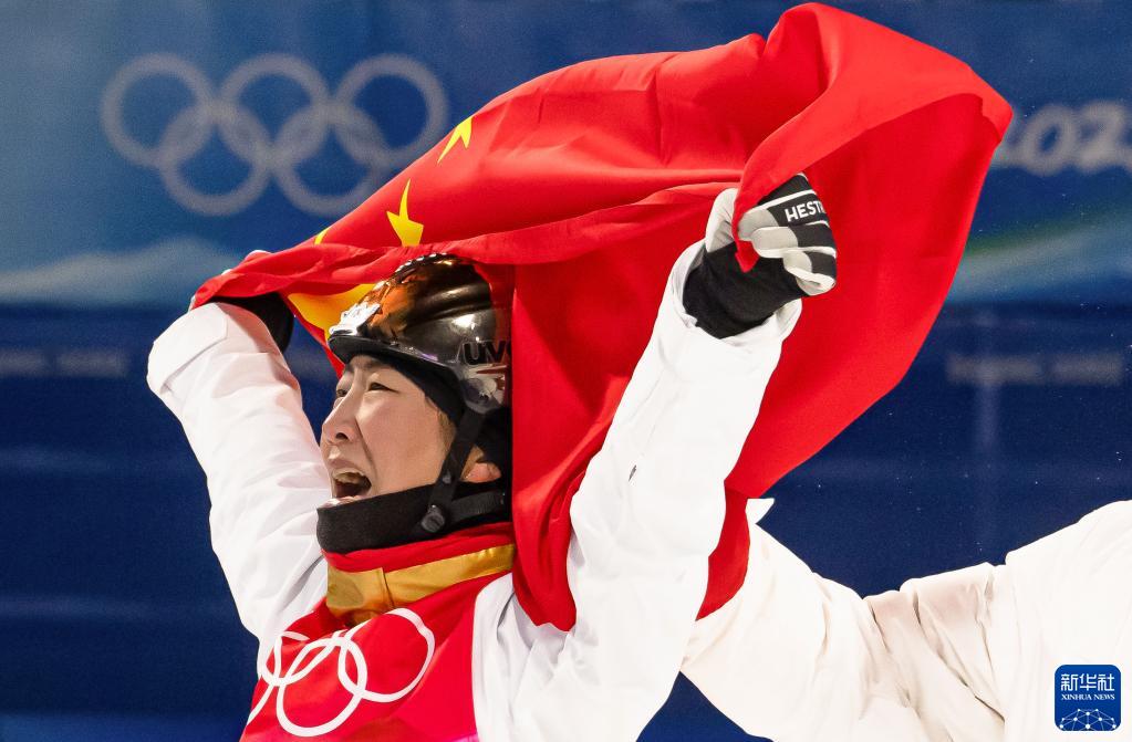 2月14日,中國選手徐夢桃在比賽后慶祝。當日,北京2022年冬奧會自由式滑雪女子空中技巧決賽在張家口云頂滑雪公園舉行,中國選手徐夢桃奪得冠軍。新華社記者 肖藝九 攝