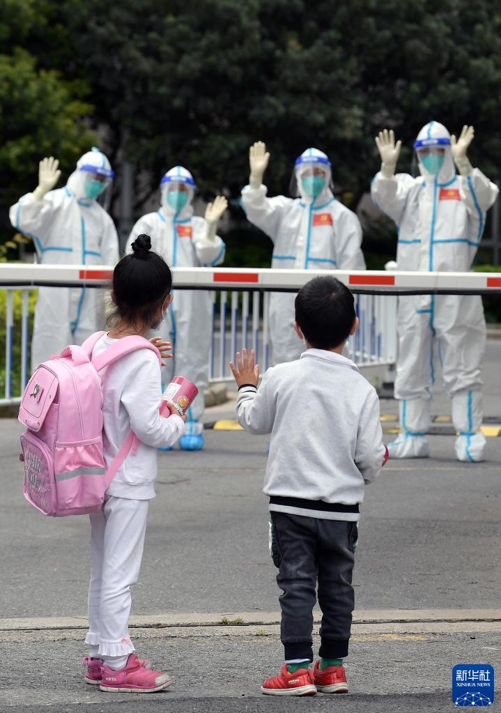 4月30日,走出醫(yī)院準(zhǔn)備回家時(shí),小華(右)和姐姐回身向護(hù)送他們出院的醫(yī)護(hù)人員揮手道別。當(dāng)日,由上海交通大學(xué)醫(yī)學(xué)院附屬仁濟(jì)醫(yī)院南部院區(qū)(新冠定點(diǎn)醫(yī)院)收治的3歲重癥新冠患者小華(化名)出院。新華社記者 李賀 攝