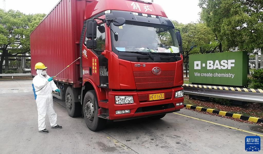 工作人員在位于上海市金山區(qū)的巴斯夫護(hù)理化學(xué)品(上海)有限公司工廠對(duì)貨車進(jìn)行消殺(4月15日攝)。新華社記者 丁汀 攝