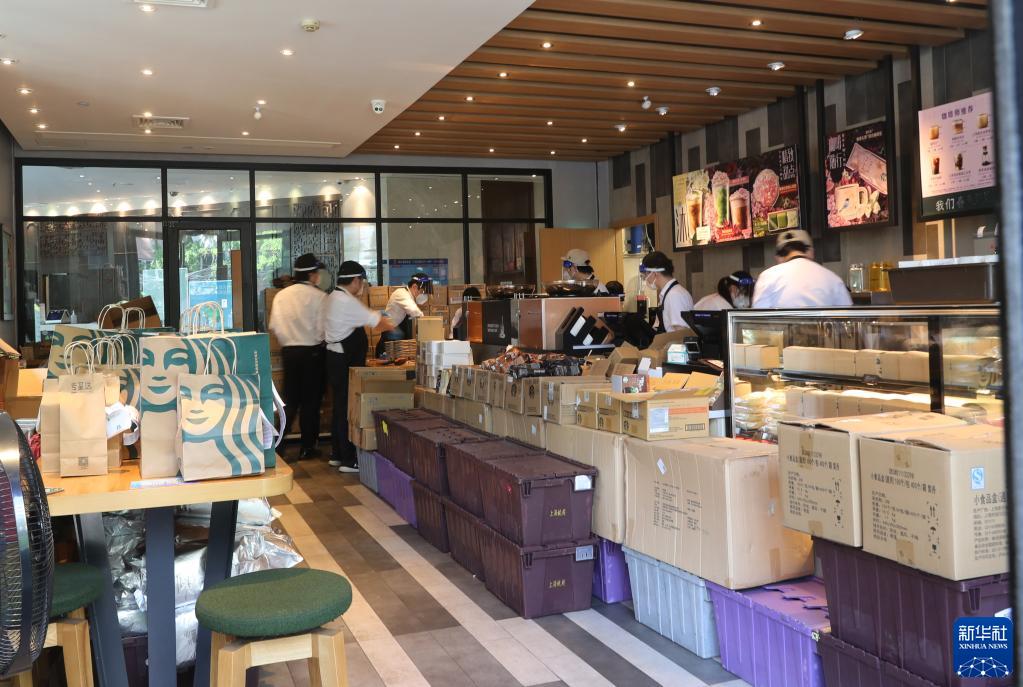 5月17日,工作人員在位于上海市徐匯區(qū)的一家星巴克咖啡店內(nèi)制作網(wǎng)絡(luò)訂單貨品。新華社記者 方喆 攝