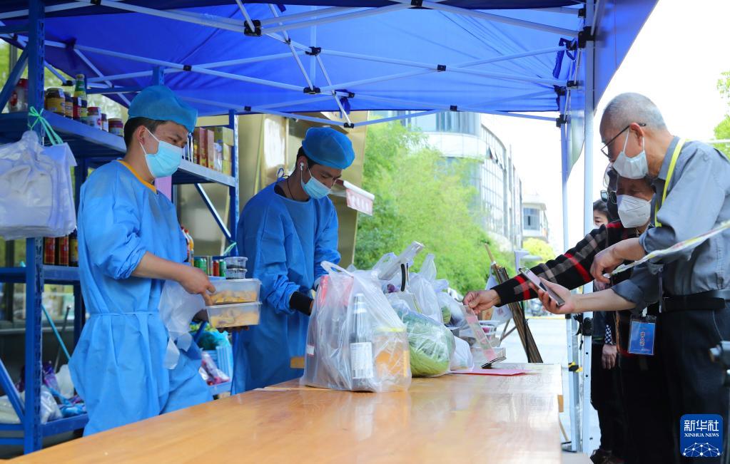 5月17日,市民在上海市嘉定區(qū)一家飯店的外賣攤位前掃碼購(gòu)物。新華社記者 方喆 攝