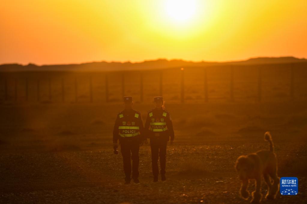 內(nèi)蒙古阿拉善邊境管理支隊銀根邊境派出所戍邊夫妻警務室的徐乃超和李文娜在邊境線附近巡邏(2022年4月18日攝)。新華社記者 彭源 攝