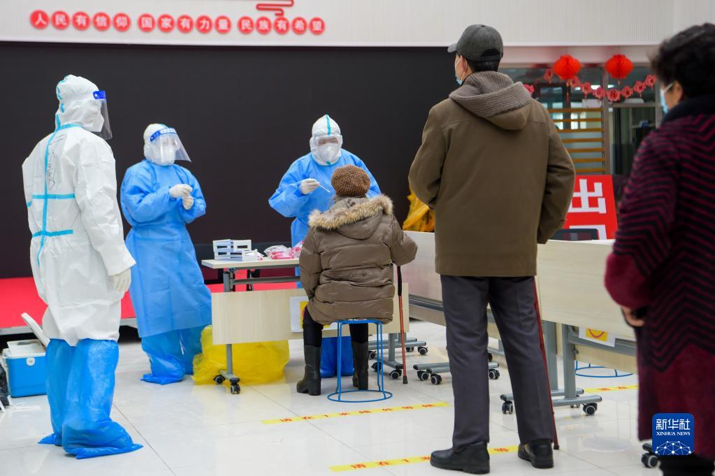 在內(nèi)蒙古滿洲里市東山街道辦事處怡園社區(qū)府欣小區(qū)A區(qū)核酸采樣點(diǎn),工作人員為居民做核酸采樣(2021年11月29日攝)。新華社記者 李志鵬 攝