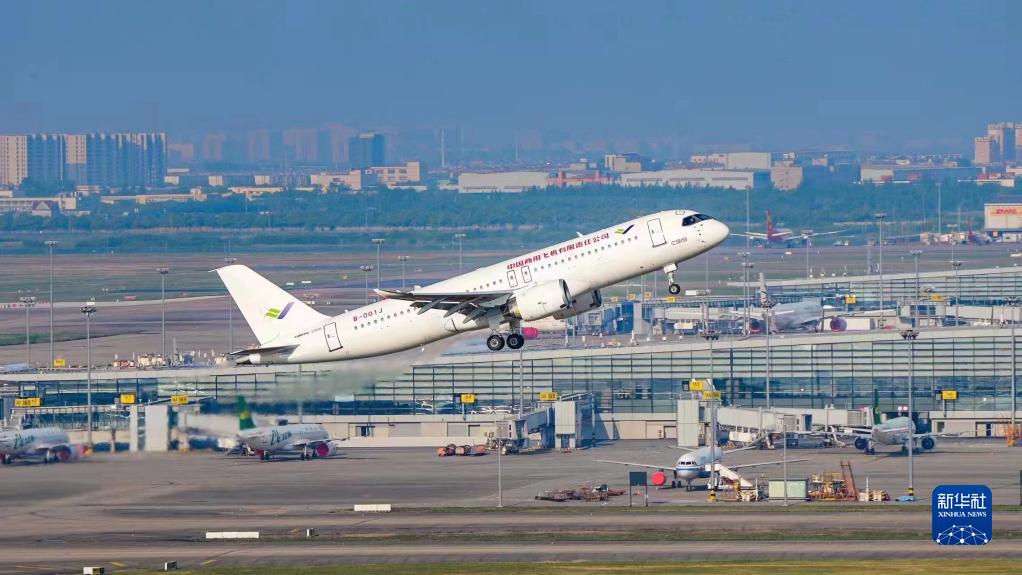 5月14日6時52分,編號為B-001J的C919大飛機(jī)從上海浦東機(jī)場第4跑道起飛,于9時54分安全降落,標(biāo)志著中國商飛公司即將交付首家用戶的首架C919大飛機(jī)首次飛行試驗(yàn)圓滿完成。新華社發(fā)