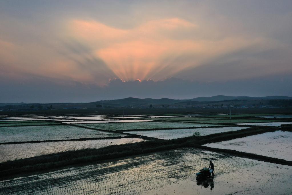 2022年5月23日,在吉林省長(zhǎng)春市朝陽(yáng)區(qū)樂山鎮(zhèn)長(zhǎng)興村,農(nóng)民操作農(nóng)機(jī)進(jìn)行水稻插秧(無人機(jī)照片)。新華社記者 張楠 攝