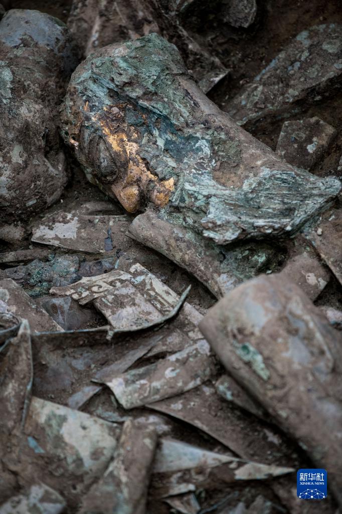 這是在三星堆遺址8號“祭祀坑”拍攝的金面罩銅頭像(6月1日攝)。新華社記者 王曦 攝