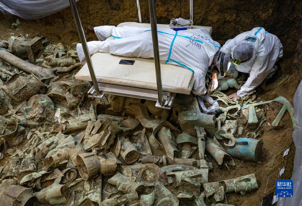 在三星堆遺址8號“祭祀坑”,8號“祭祀坑”發(fā)掘負(fù)責(zé)人、北京大學(xué)考古文博學(xué)院副教授趙昊(左)與考古工作者任俊鋒一起清理銅神壇(6月1日攝)。新華社記者 沈伯韓 攝