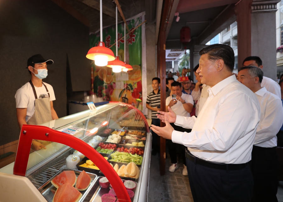 ↑2020年10月12日至13日,習(xí)近平在廣東考察。這是13日下午,習(xí)近平在汕頭市小公園開埠區(qū),同商鋪店員親切交流,了解復(fù)商復(fù)市和常態(tài)化疫情防控情況。