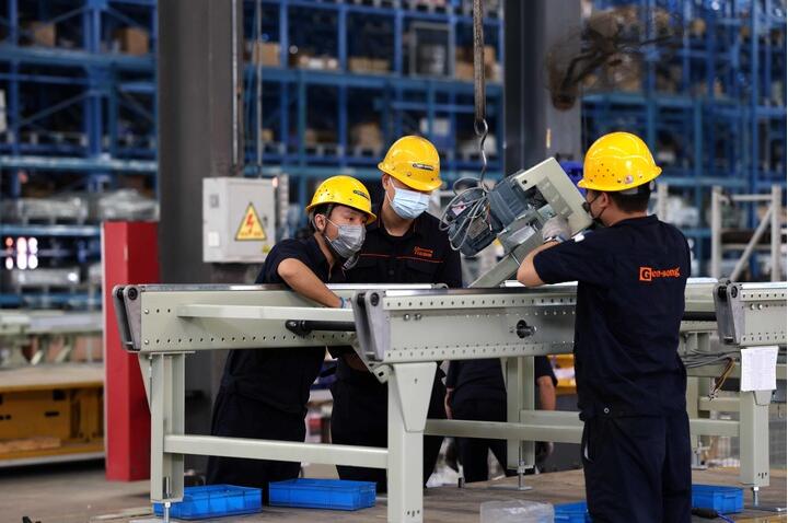 圖為5月31日在安徽合肥新站高新區(qū)一家智能科技產(chǎn)品生產(chǎn)企業(yè),工人在產(chǎn)品裝配生產(chǎn)線上作業(yè)。新華社發(fā)
