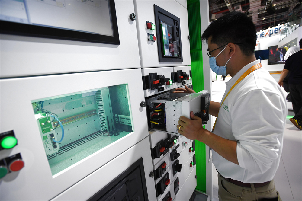 2020年11月5日,在上海舉行的第三屆進(jìn)博會技術(shù)裝備展區(qū),施耐德電氣展臺工作人員在操作“Okken新一代預(yù)智低壓成套設(shè)備”。新華社記者 李任滋 攝