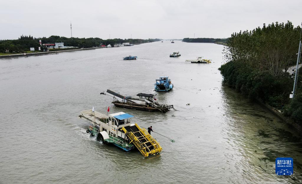 蘇浙滬三地的保潔船在太浦河水域聯(lián)合清理水面浮游植物(2020年10月15日攝,無人機照片)。當日,來自蘇州市吳江區(qū)、上海市青浦區(qū)和嘉興市嘉善縣的三名河長在位于長三角生態(tài)綠色一體化發(fā)展示范區(qū)的蘇浙滬交界水域太浦河流域附近開展聯(lián)合巡河活動。新華社記者 方喆 攝