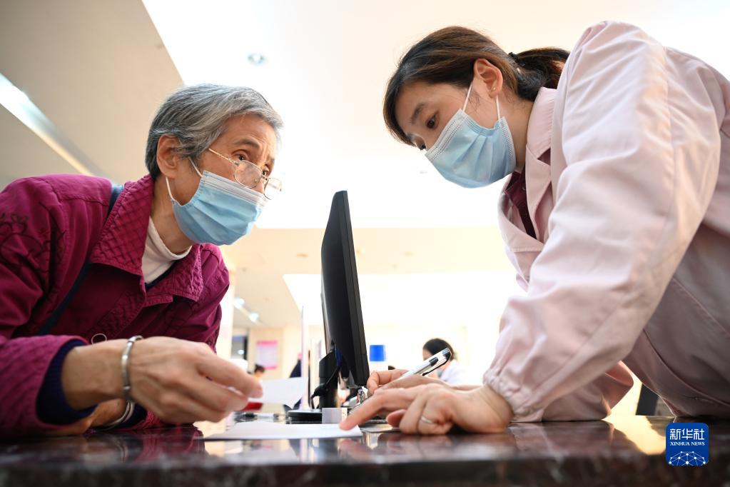 福建省三明市第一醫(yī)院的醫(yī)保辦工作人員(右)向前來咨詢藥品報銷問題的居民講解相關(guān)政策(2020年11月18日攝)。新華社記者 姜克紅 攝