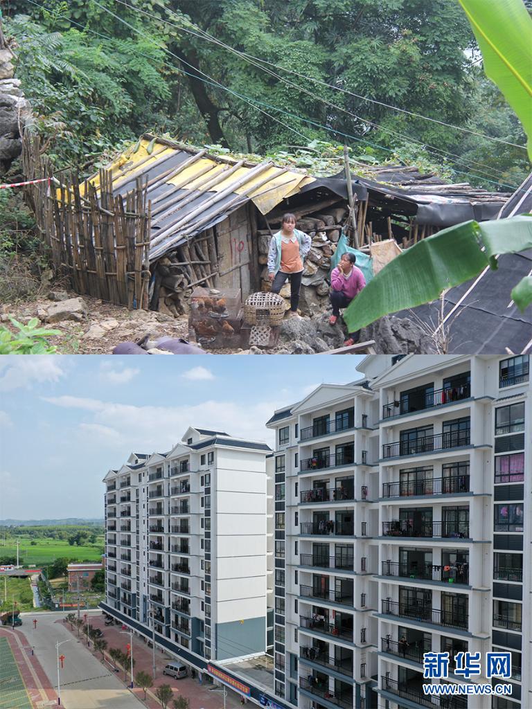 這是一張拼版照片,上圖為:2018年11月11日在廣西田東縣思林鎮(zhèn)龍邦村拍攝的村民和自家簡(jiǎn)陋的房屋(思林鎮(zhèn)政府供圖);下圖為:2019年8月28日拍攝的當(dāng)?shù)貫辇埌畲逍陆ǖ奈挥谔飽|縣思林鎮(zhèn)的易地扶貧搬遷安置點(diǎn)(無人機(jī)照片,新華社記者曹祎銘攝)。新華社發(fā)