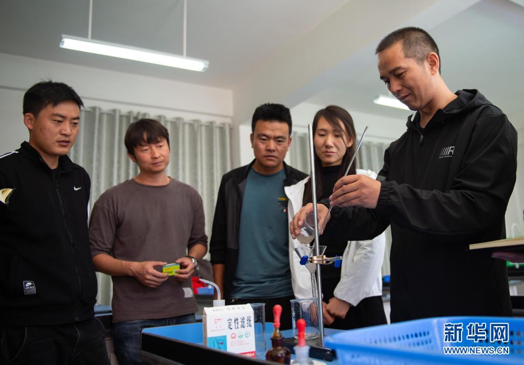北京市援青支教教師、來自通州區(qū)陸辛莊學(xué)校的化學(xué)教師祁生貴(右一)在青海省玉樹州第四民族高級(jí)中學(xué)指導(dǎo)學(xué)校教師進(jìn)行實(shí)驗(yàn)教學(xué)(2020年8月12日攝)。新華社記者 陳鐘昊 攝
