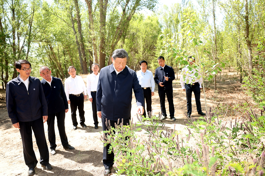 2023年6月5日至6日,中共中央總書記、國家主席、中央軍委主席習近平在內(nèi)蒙古巴彥淖爾考察,并主持召開加強荒漠化綜合防治和推進“三北”等重點生態(tài)工程建設(shè)座談會。這是5日下午,習近平在烏梁素??疾?。新華社記者 謝環(huán)馳 攝