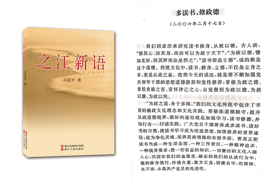 2006年2月17日,時任浙江省委書記的習(xí)近平用筆名“哲欣”在《浙江日報(bào)》“之江新語”專欄發(fā)表題為《多讀書,修政德》的文章。他說,我們國家歷來講究讀書修身、從政以德。廣大黨員干部要養(yǎng)成多讀書、讀好書的習(xí)慣,使讀書學(xué)習(xí)成為改造思想、加強(qiáng)修養(yǎng)的重要途徑,成為凈化靈魂、培養(yǎng)高尚情操的有效手段。