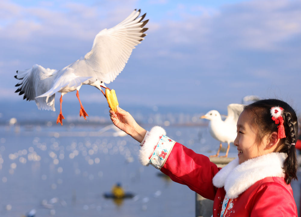 ??游客在昆明滇池邊投喂紅嘴鷗(2024年1月17日攝)。新華社發(fā)(劉元嵩攝)