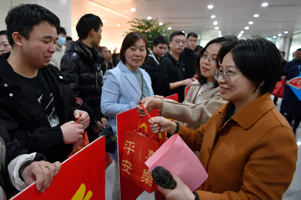 2024年2月15日,福州市人社部門工作人員(前右)向乘坐包機(jī)抵榕的返崗務(wù)工人員送上新春大禮包。當(dāng)日,來自云南、貴州的364名返崗務(wù)工人員乘坐的飛機(jī)降落在福州長樂國際機(jī)場。這是2024年春節(jié)后福州市人社部門通過免費包機(jī)接回的首批重點企業(yè)返崗務(wù)工人員。新華社記者 魏培全 攝