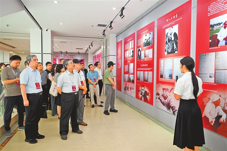 7月30日,全國(guó)多地的經(jīng)濟(jì)媒體負(fù)責(zé)人來(lái)到河南開(kāi)封科技傳媒學(xué)院,參觀“勿忘人民——學(xué)習(xí)穆青、增強(qiáng)‘四力’”主題展。 河南日?qǐng)?bào)社全媒體記者 朱哲 攝