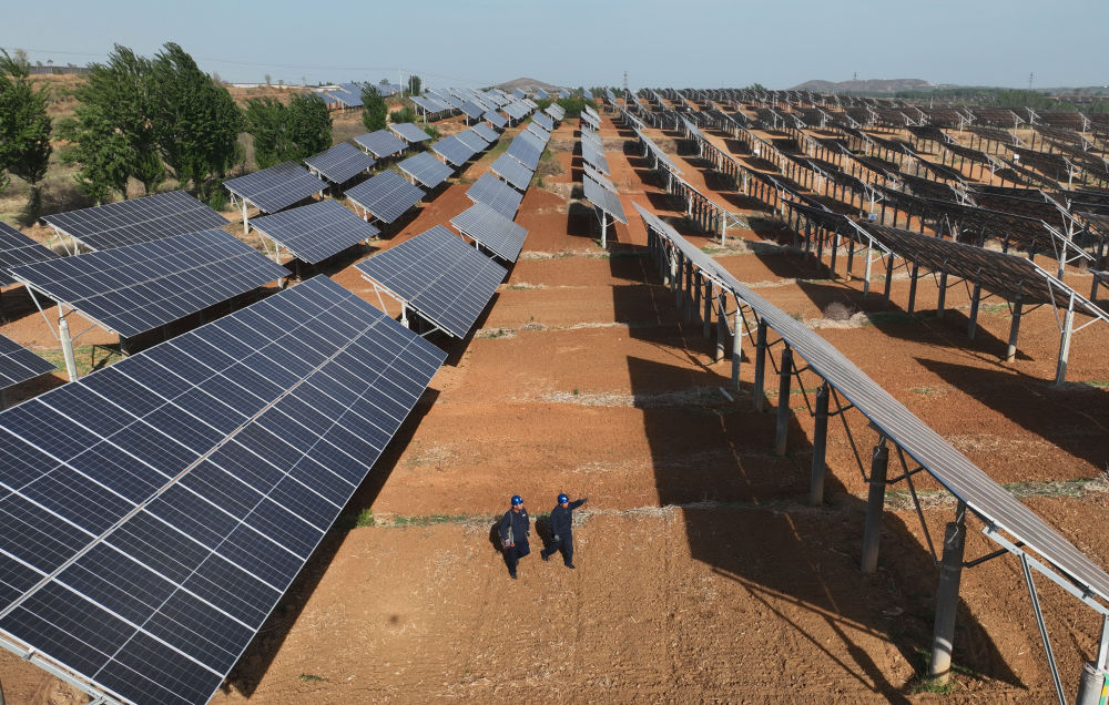 ??2024年4月16日,工人在河北省石家莊市靈壽縣譚莊鄉(xiāng)程家莊村的“農(nóng)光互補(bǔ)”光伏發(fā)電場巡查(無人機(jī)照片)。新華社記者 楊世堯 攝