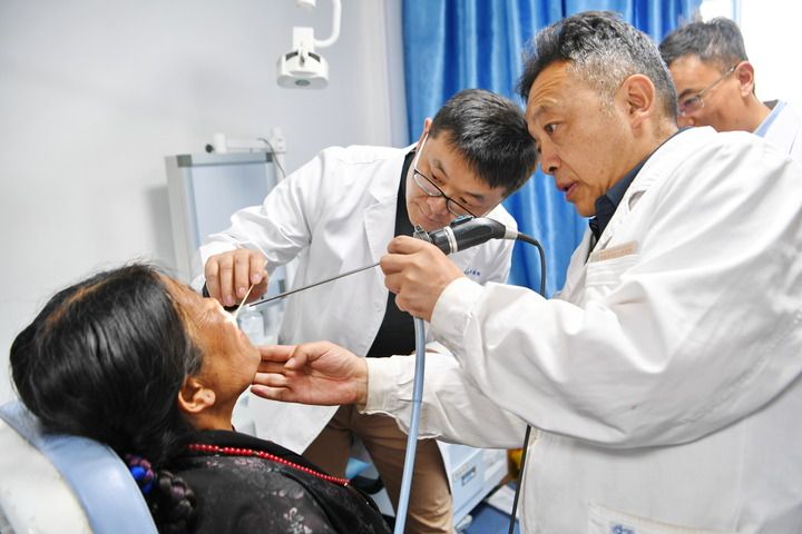 ??中國醫(yī)學科學院整形外科醫(yī)院王克明博士(左后)和西藏自治區(qū)人民醫(yī)院巴羅主任(右前)為患者查體(2024年8月27日攝)。新華社記者 張汝鋒 攝