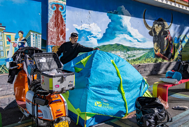 ??經國道318線前往西藏旅游的重慶游客張靜在芒康縣如美鎮(zhèn)拉烏村整理帳篷(2023年10月20日攝)。新華社記者 孫非 攝