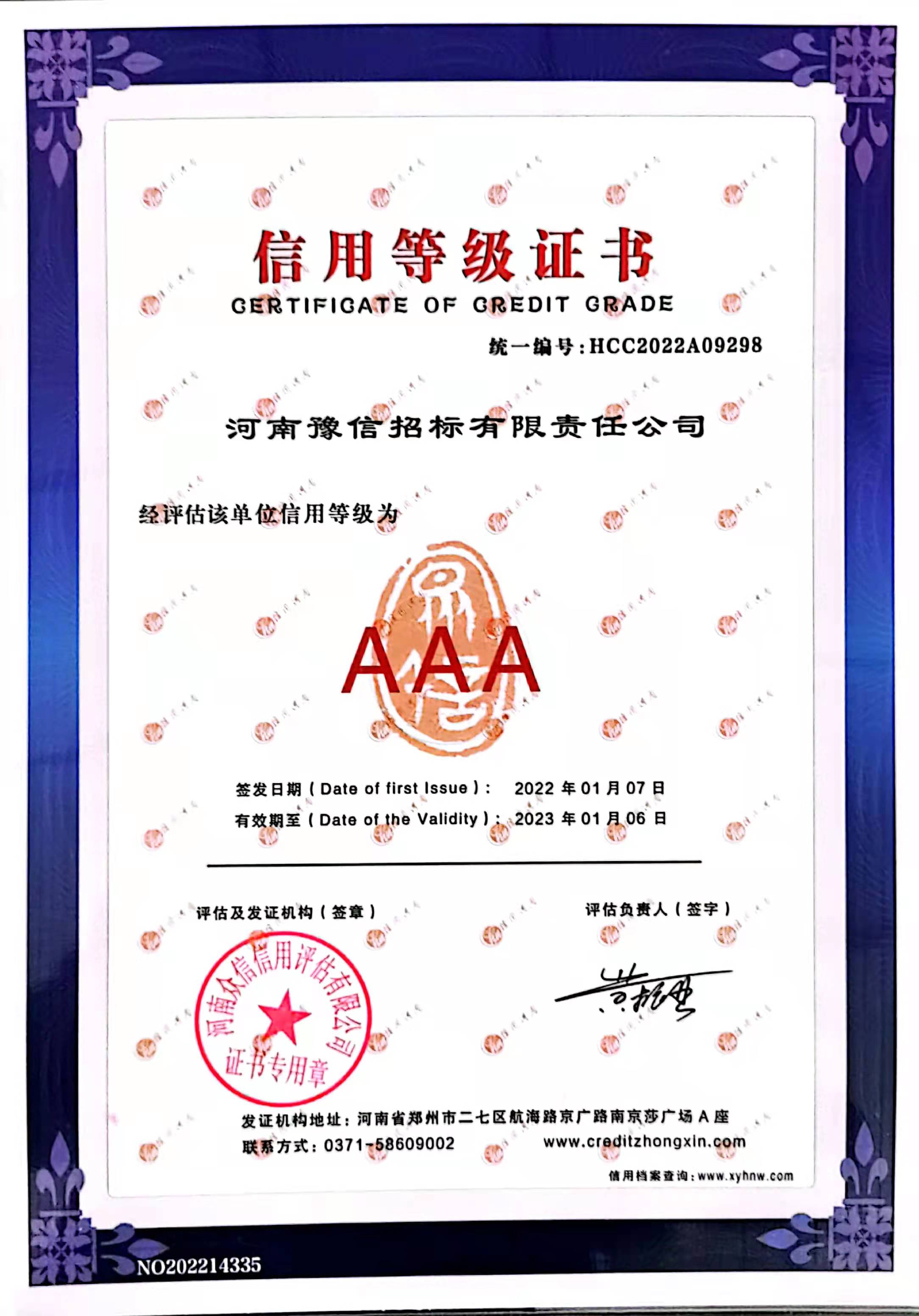 工程招標(biāo)代理機(jī)構(gòu)信用等級(jí)證書(shū) -