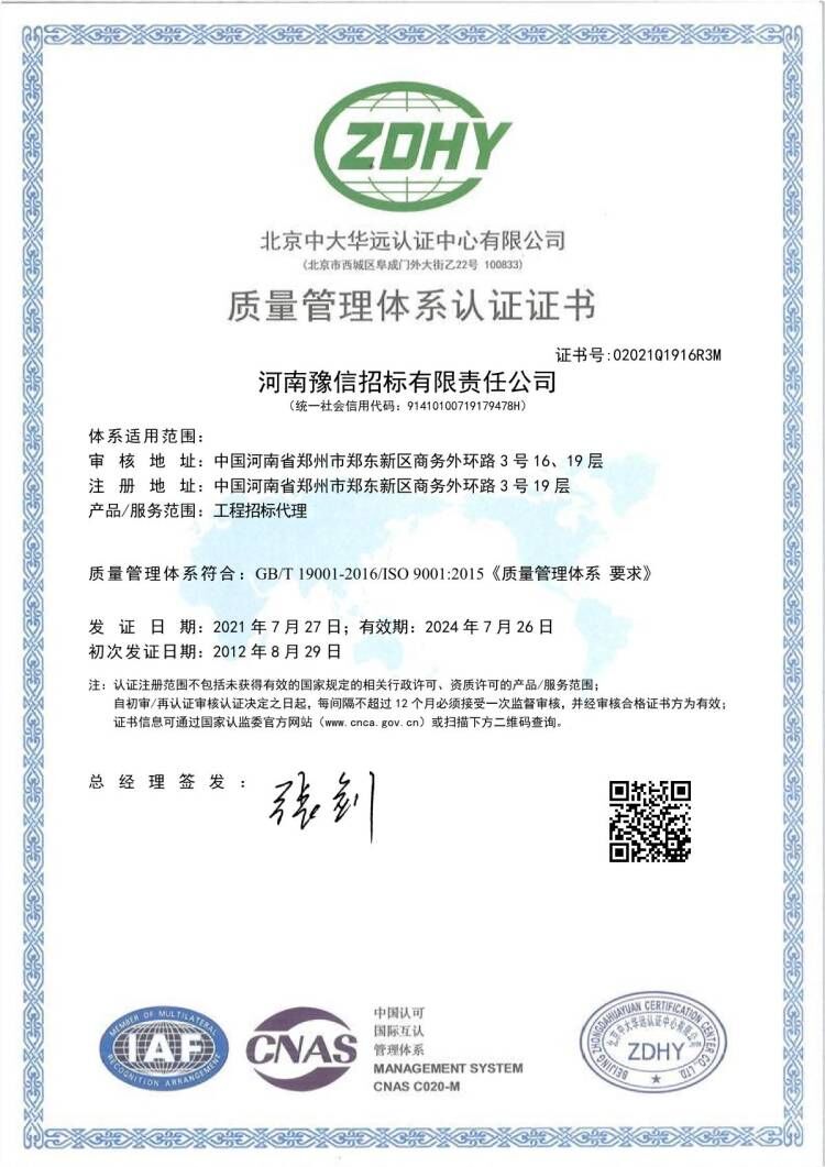 河南豫信招標有限責任公司QMS質量管理系體認證證書中文