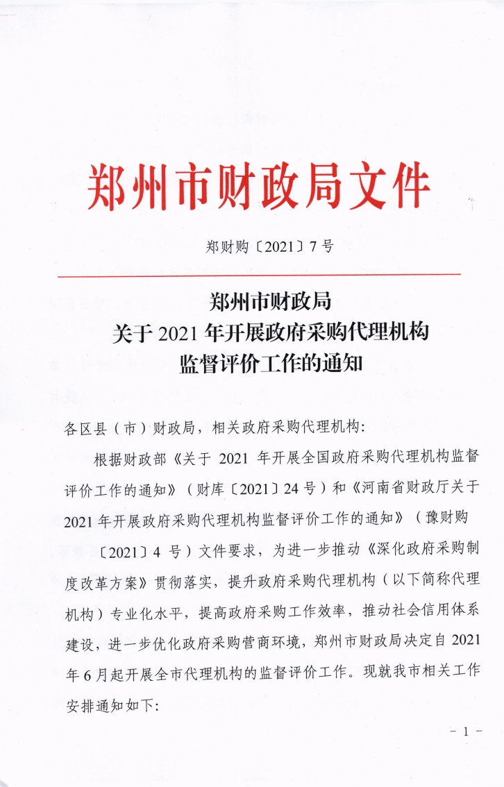 鄭州市財政局 關(guān)于2021年開展政府采購代理機(jī)構(gòu)監(jiān)督評價工作的通知