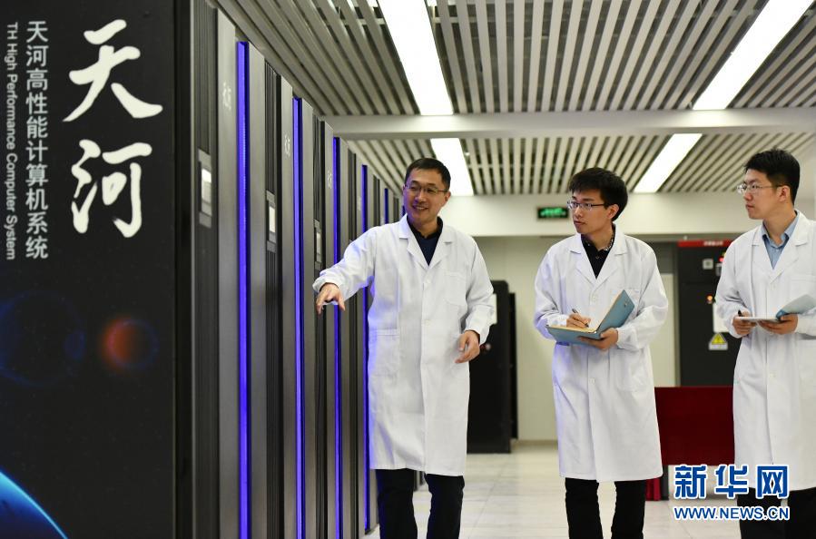 在國家超級計算天津中心“天河三號”原型機機房內,應用研發(fā)部部長孟祥飛(左)和同事一起巡查(2019年4月24日攝)。新華社記者 李然 攝