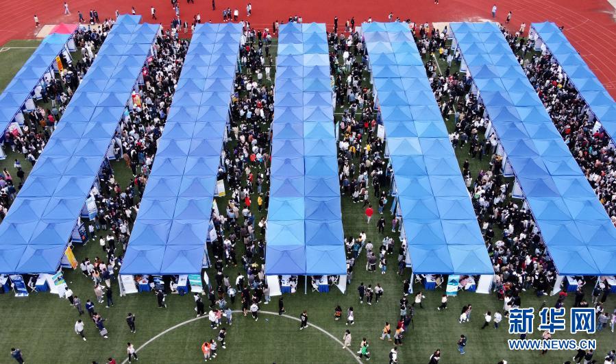 這是10月28日拍攝的上海市2021屆高校畢業(yè)生秋季校園招聘會現場(無人機照片)。新華社記者 劉穎 攝