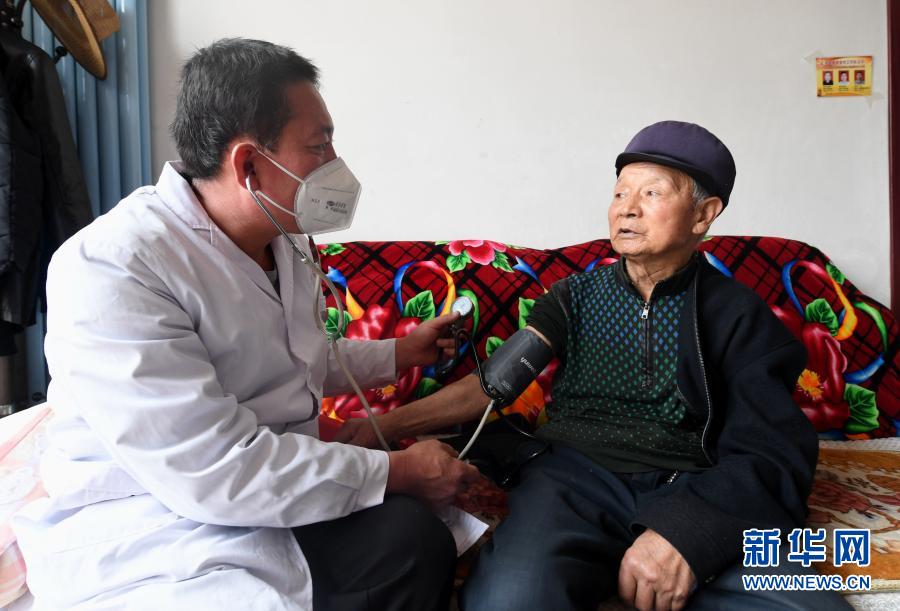 河北阜平縣龍泉關鎮(zhèn)顧家臺村村醫(yī)為村民測量血壓(4月15日攝)。新華社記者 王曉 攝