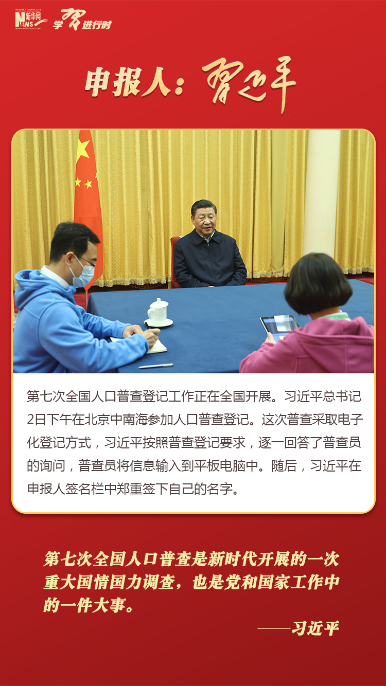 習(xí)近平在北京中南海參加全國(guó)人口普查登記,帶頭申報(bào)。他按照普查登記要求,逐一回答了普查員的詢問(wèn),并在申報(bào)人簽名欄中鄭重簽下自己的名字。