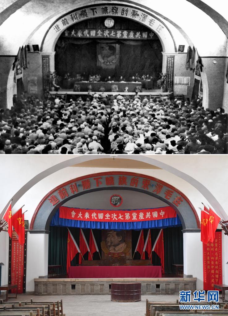 拼版照片:上圖為中國共產(chǎn)黨第七次全國代表大會會場(資料照片,新華社發(fā));下圖為2021年3月31日拍攝的位于延安市楊家?guī)X革命舊址的中國共產(chǎn)黨第七次全國代表大會會場(新華社記者張博文攝)。新華社發(fā)