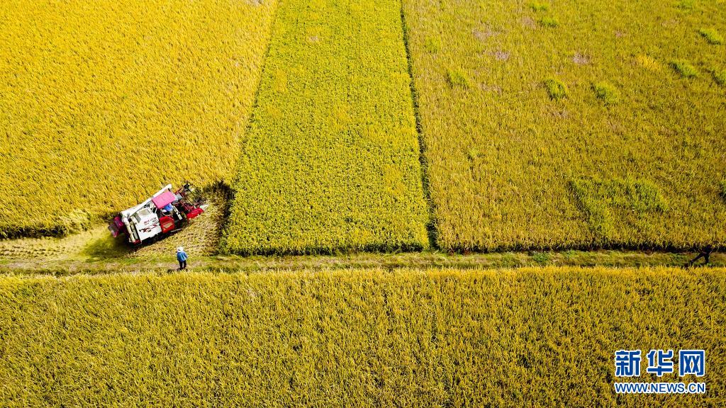 2020 年 10 月 21 日,在山東省棗莊市臺(tái)兒莊區(qū)邳莊鎮(zhèn),收割機(jī)在收獲水稻(無人機(jī)照片)。 新華社記者 郭緒雷 攝