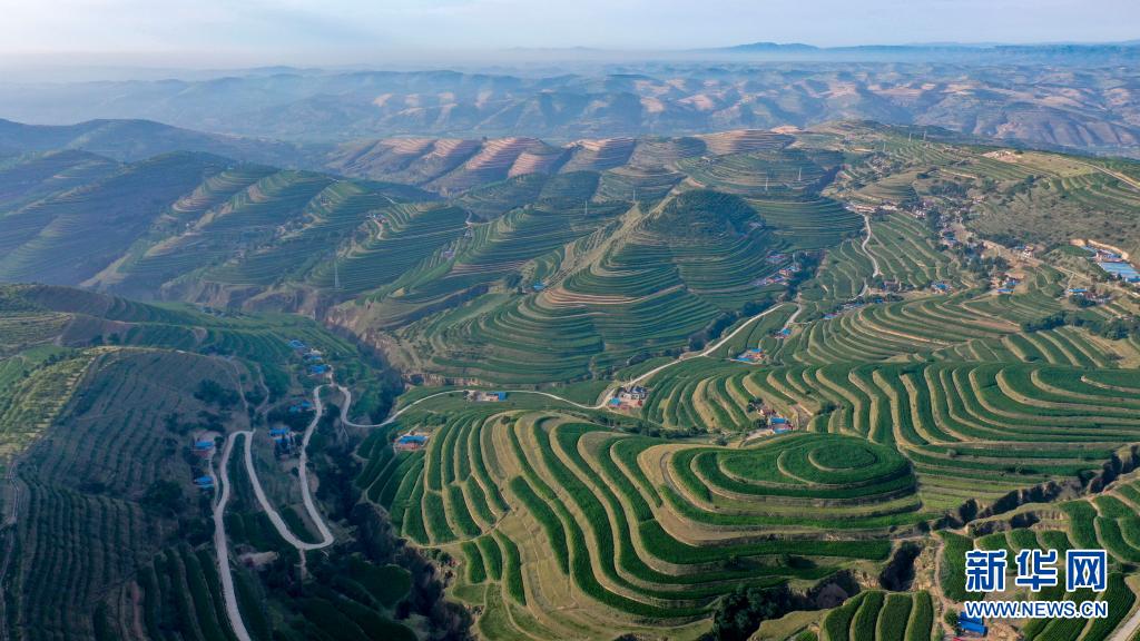 這是7月13日在寧夏固原市彭陽縣拍攝的青云灣旱作梯田公園(無人機(jī)照片)。新華社記者 馮開華 攝