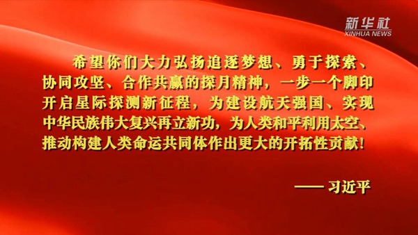 ?? 習(xí)近平總書記曾用“追逐夢想、勇于探索、協(xié)同攻堅、合作共贏”這16個字高度概括總結(jié)了“探月精神”,勉勵航天工作者們一步一個腳印開啟星際探測新征程,為建設(shè)航天強(qiáng)國、實現(xiàn)中華民族偉大復(fù)興再立新功。