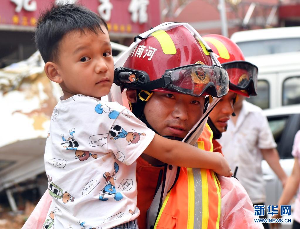 7月21日,在鞏義市米河鎮(zhèn),消防救援人員幫助群眾轉(zhuǎn)移。新華社記者 李嘉南 攝