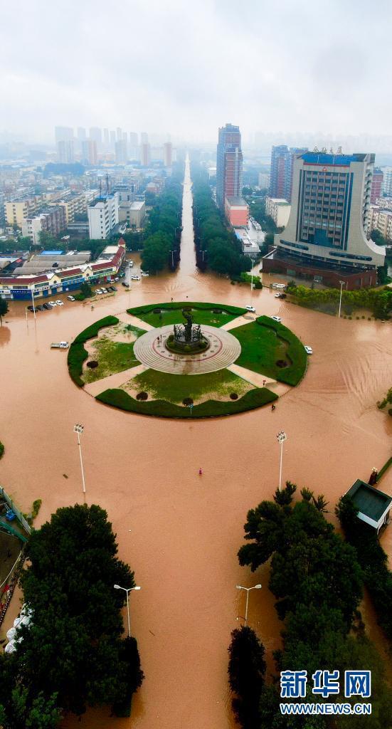 7月22日,河南安陽開發(fā)區(qū)七仙女環(huán)島被淹沒(無人機(jī)拍攝)。新華社發(fā)(馬丁 攝)