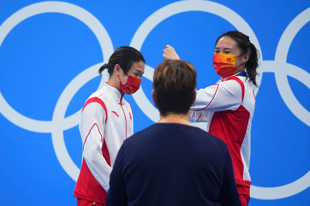 7月25日,中國選手王涵(右)在頒獎(jiǎng)儀式上為隊(duì)友施廷懋戴金牌。新華社記者 許暢 攝